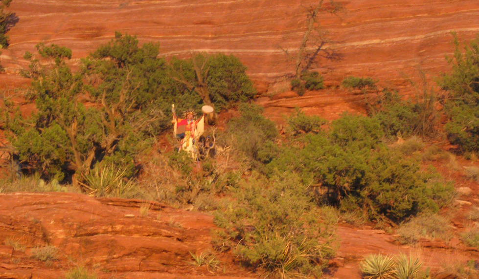 Well we looked around for where the sound was coming from. My person thought it might be from the top of Sugarloaf where the tiny flute player had been awhile back, but she couldn’t see anyone up there. Then we saw him. On the side of Sugarloaf, partway up. All dressed out in Native American clothing and holding a rattle and a drum. I didn’t know what to make of all his chanting.