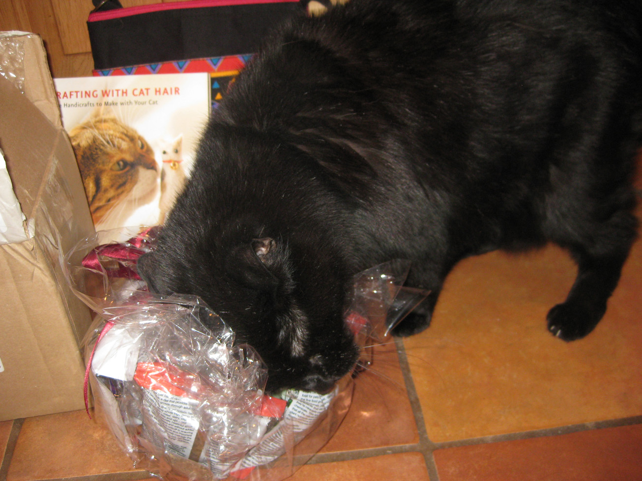 Then a package came with a book in it. The book is called Crafting with Cat Hair. I was afraid Bongo would to steal all my hair and try to do something with it so I guarded that package carefully.