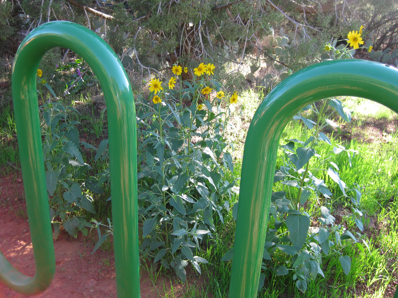 This time of year the sunflowers are out. I don’t see any of them when I’m on my trails, but they show up along the roadsides and they even show up in my backyard. And this year they showed up at the beginning of my trails. We didn’t have a bike rack here last year. That must be the attraction. The sunflowers wanted to hang out with the bike rack.
