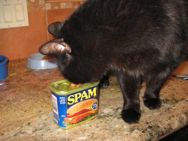This time Scratchy got caught. He got up on the counter and he licked the Spam on my younger person’s plate. In broad daylight, with everyone watching, Scratchy licked that Spam.