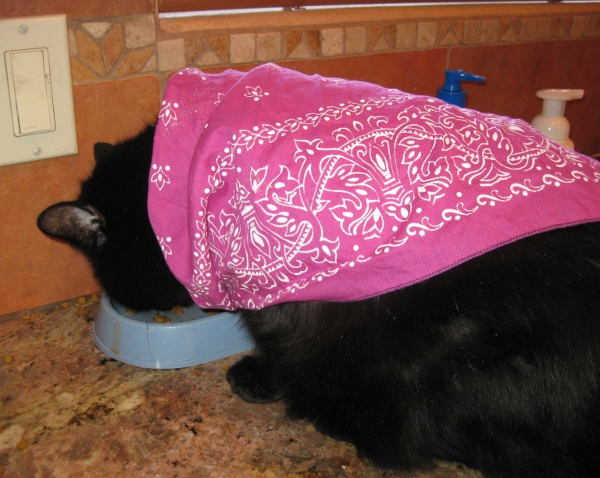Somehow a bow didn’t seem like enough for celebrating Dress Up Your Pet Day, so I got a scarf for Scratchy.