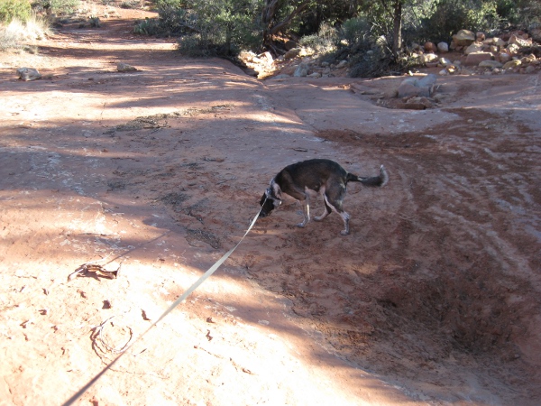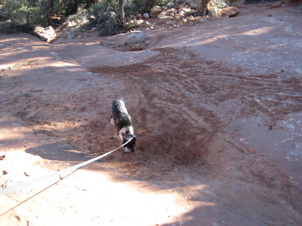 Bongo in puddle spot with dirt  spread outOh dear! Why is my Detective Dog hat always so far away when I need it? And why have there been so many strange happenings on my trails lately?