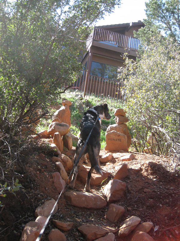 Bongo climbing stone stepsI was walking down the wash on my trails and I found some really cool stairs. I thought I’d check them out. And the only way I know how to check out stairs is to climb them.