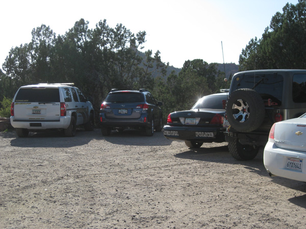 Police Car in Parking LotAs I headed to my trails today I noticed that the parking lot was full of cars. This happens a lot on my trails but today those cars looked different than the cars I usually see.