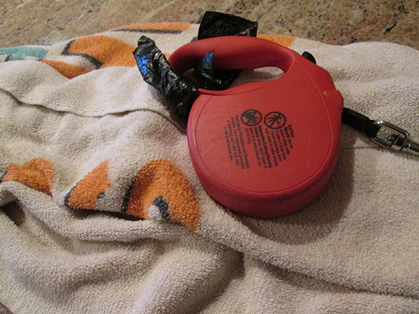 Red leash on a towelPerson, I have no idea how this towel got out here under my leash because I wasn’t out getting wet in the rain.