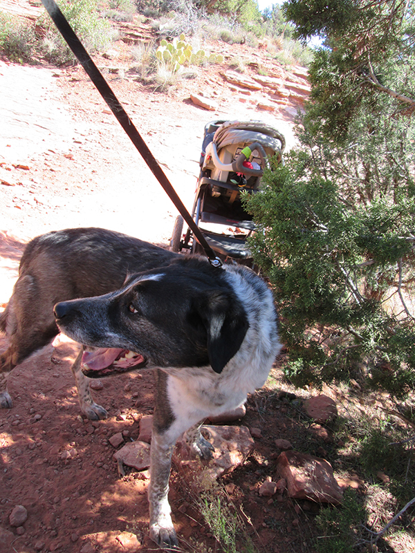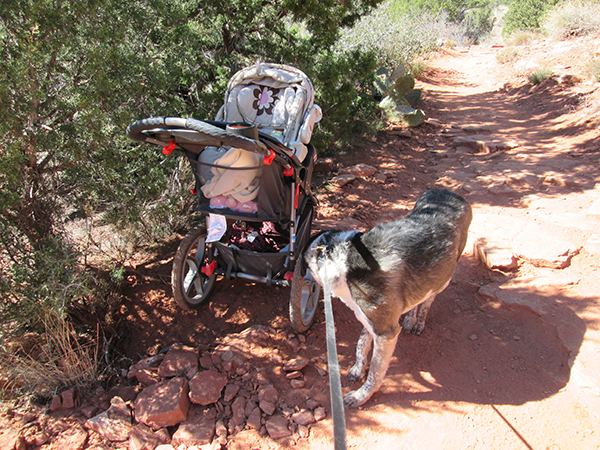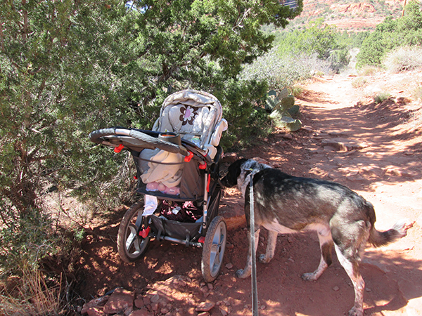 Bongo sniffing a stroller on the side of the trailHmmm.