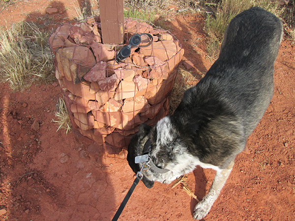 Bongo sniffing the cairn the doggles are sitting onYup!