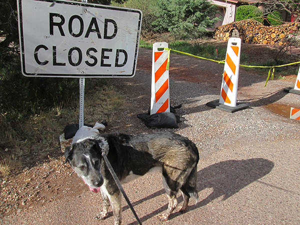 Bongo dog in front of a Road Closed sign at the trailhead entrance.