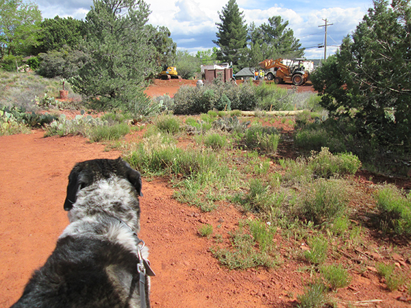 Bongo dog watching construction vehicles dig up the parking lot of his trailhead.