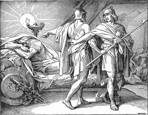 David found out where King Saul had camped and he went there and saw where Saul and Abner, the commander of the army, had lain down. Saul was inside the camp with his army around him, and he had stuck his spear in the ground near his head.